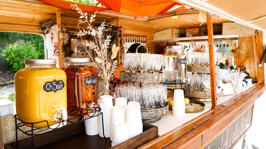 Mit Sekt-Cocktails, alkoholfreien Alternativen sowie einer liebevoll gestalteten Kindergetränkebar verwöhnen wir eure Gäste in nostalgischer Atmosphäre. Zwei Servicekräfte betreuen eure Gesellschaft vor Ort, übernehmen Ausschank und Organisation, während ihr euren besonderen Moment ganz unbeschwert genießen könnt. ✨